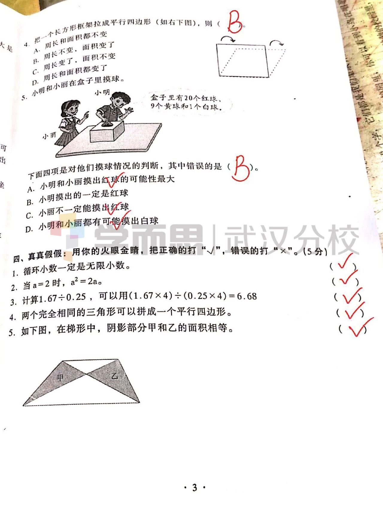 2019年武汉市江岸区小学五年级数学期末卷(图片版)(9)