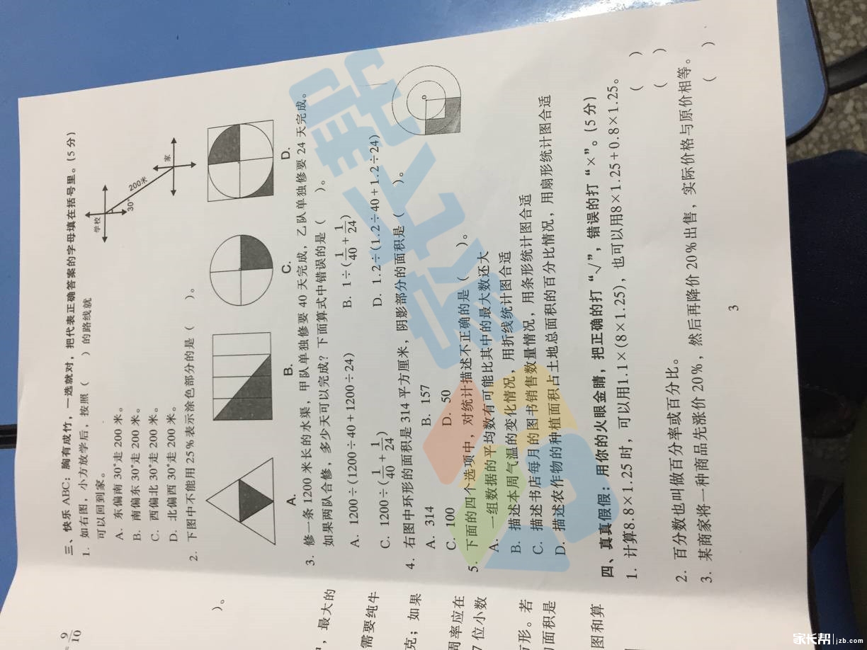 2019年武汉市江岸区小学六年级数学期末卷(图片版)(3)