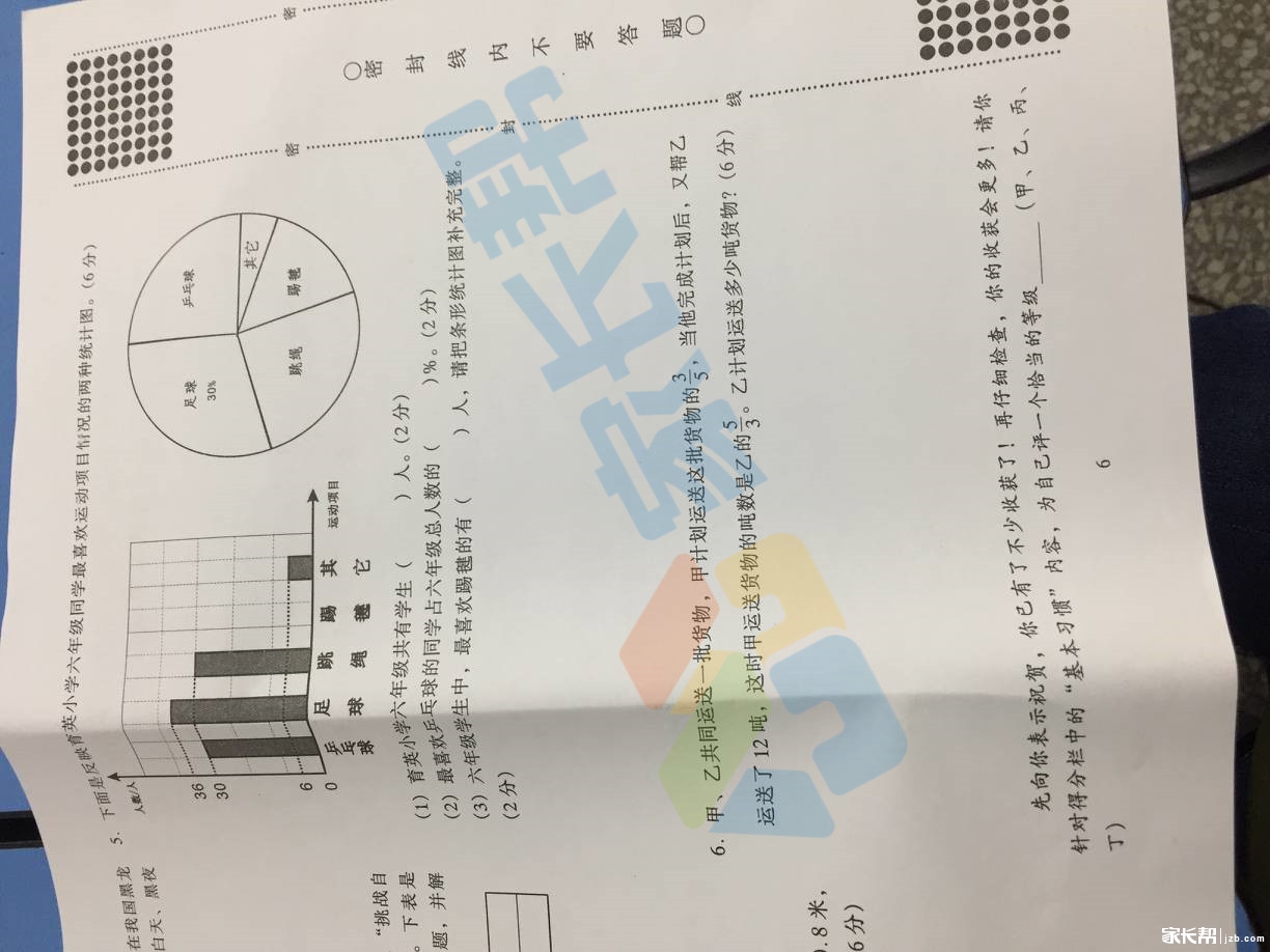 2019年武汉市江岸区小学六年级数学期末卷(图片版)(6)