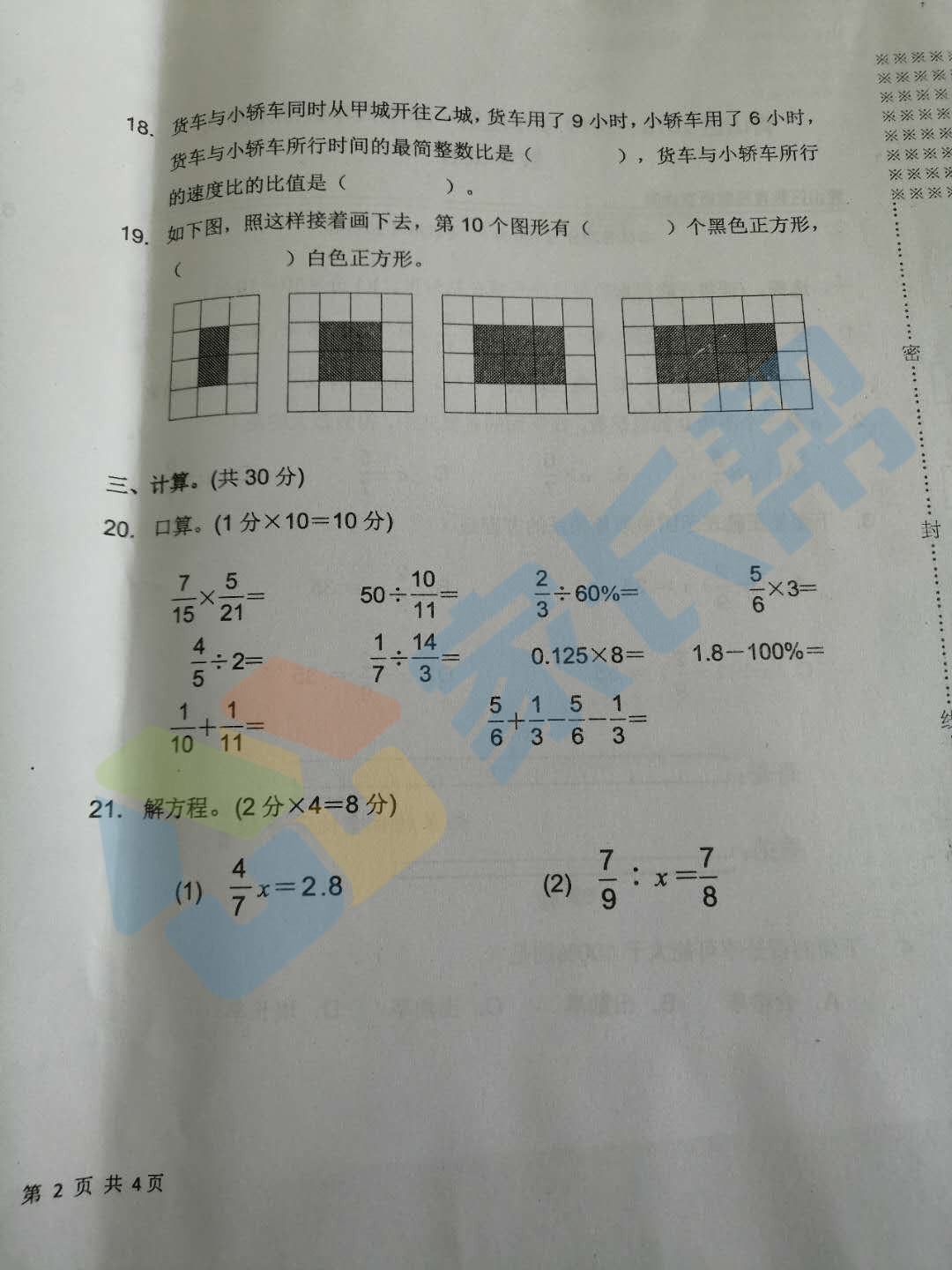 2019年武汉市青山区小学六年级数学期末卷(图片版)(4)