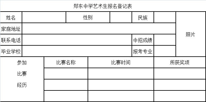 1、高一:8月4日前,持成绩单、准考证、本省户口本到郑东中学招生办报名,填写艺术生登记表并交照片2张。