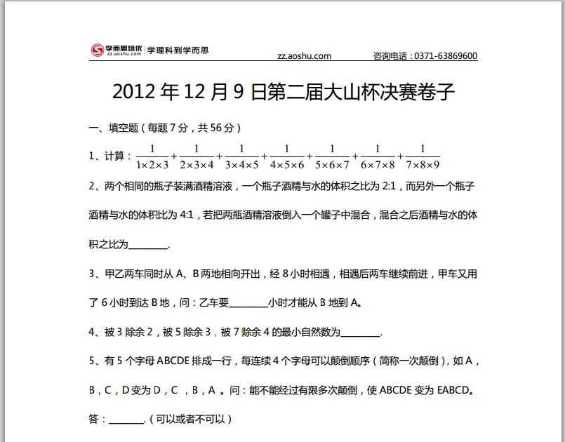 郑州奥数网讯 2012年12月9日第二届“大山杯”决胜名校少儿数学邀请赛进行决赛,感谢郑州学而思培优提供本次真题详解。(相关阅读:决赛试题详解)