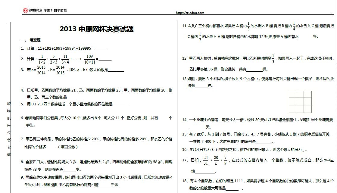 为了帮助参加中原网杯决赛的孩子们及时对考试完成情况有一个了解、并根据考试查漏补缺。学而思名师团队会在第一时间公布参考答案,后续我们还会对试卷进行搜集整理,展现给大家。并且会对试题进行分析,从而帮助孩子们更好的进行后续的学习。敬请期待!