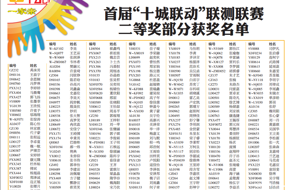 2015河南十城联动联测联赛二等奖获奖部分名单 郑州奥数网 2015-05-27 12:42:43 首届河南省“十城联动”小学生学业水平联测联赛获奖名单出来了,下面是二等奖部分获奖名单,赶紧来看看有没有你。