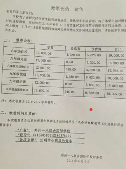 郑州一八联合学校学费情况