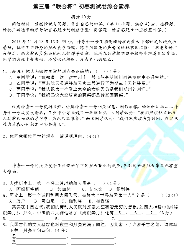 2017年郑州联合杯初赛将于12月4日开考,联合杯考试时间:12月4日9:30——11:30(提前30分钟到达考点),考试内容:语、数、英、综合。期中语文70分、数学90分、英语40分、综合40分。大家准备的怎么样了,郑州奥数网第一时间公布此次试题及答案,预祝大家取得好的成绩。