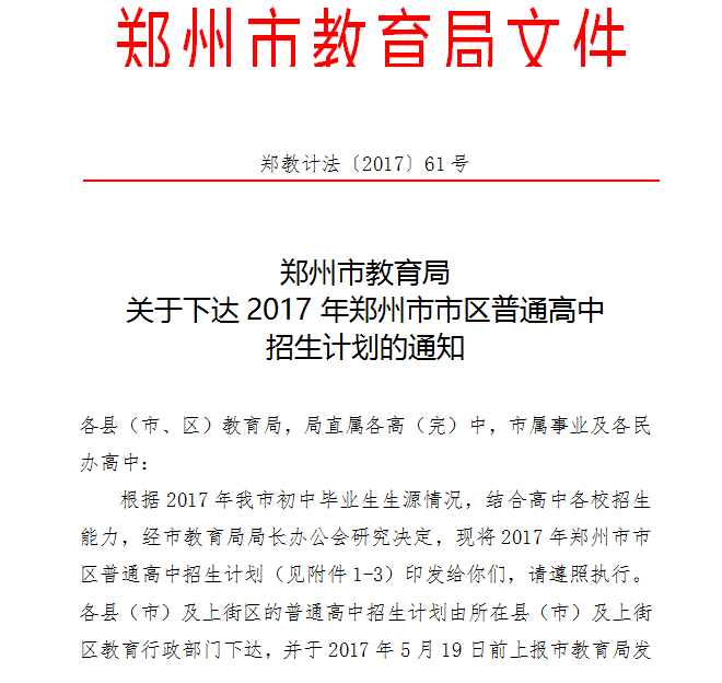 根据2017年我市初中毕业生生源情况,结合高中各校招生能力,经市教育局局长办公会研究决定,现将2017年郑州市市区普通高中招生计划(见附件1-3)印发给你们,请遵照执行。各县(市)及上街区的普通高中招生计划由所在县(市)及上街区教育行政部门下达,并于2017年5月19日前上报市教育局发规处备案。