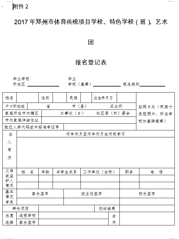 2017郑州体育传统项目学校特色学校(班)艺术团报名登记表
