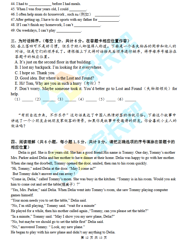 2017年郑州豫才过程性评价四年级英语真题(2)