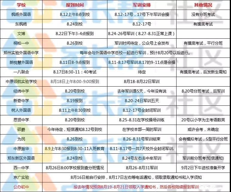 2018年郑州部分学校开学/分班考试/军训/时间汇总