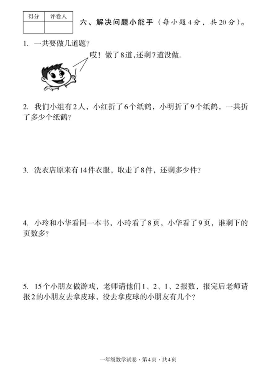 2019年郑州市小学一年级数学期末模拟卷二(图片版)(4)