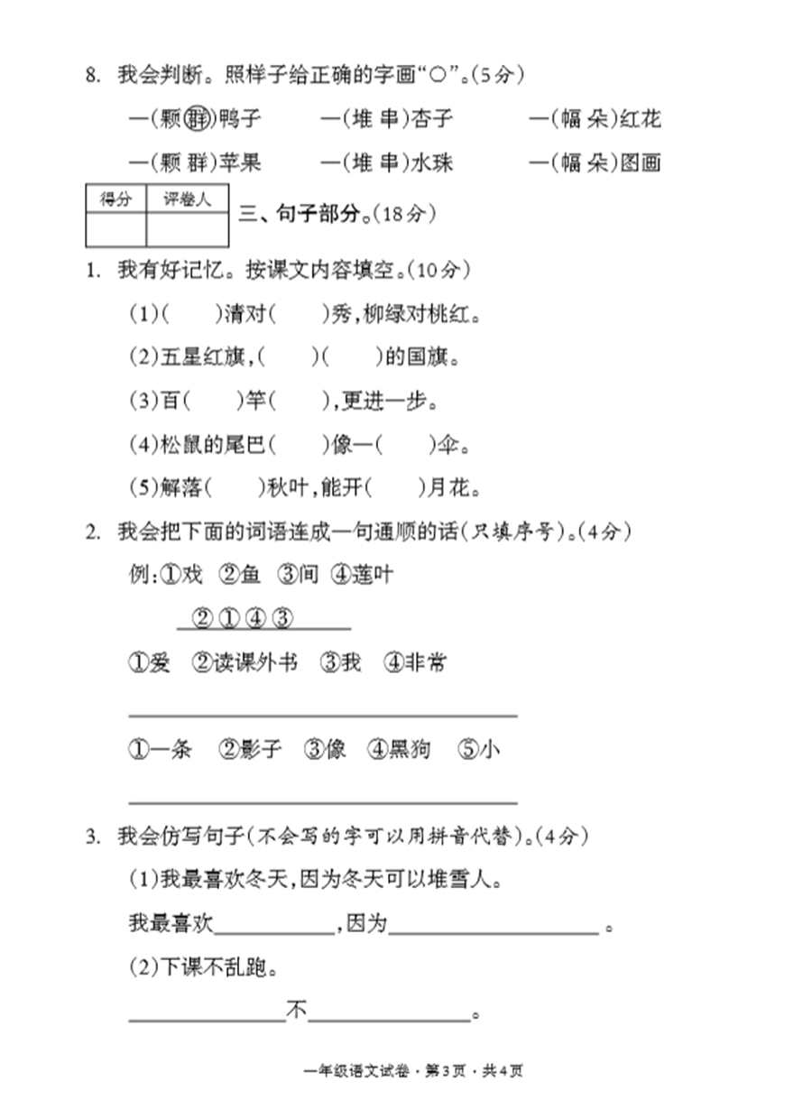 2019年郑州市小学一年级语文期末模拟卷三(图片版)(3)
