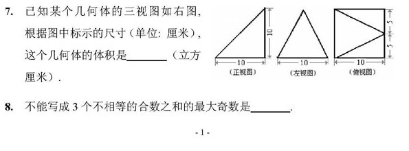 第十六届华杯赛决赛真题第七、八题及答案 本站原创 2011-04-16 11:10:42 B卷参考答案: 7.1000/3; 8.17; 相关阅读: 2011年第十六届华杯赛决赛试题及解答(北京) 2011年第十六届华杯赛决赛试题(初中卷)