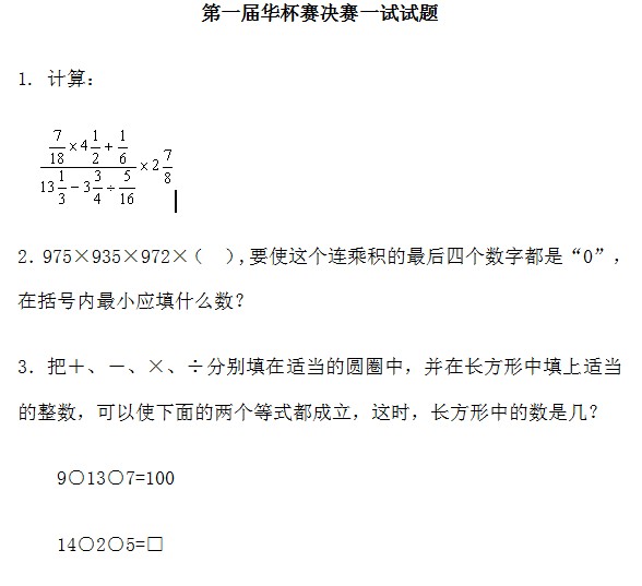 第一届华杯赛决赛一试试题及答案 成都中考网 2011-07-29 09:41:46 请下载附件: 第一届华杯赛决赛一试试题及答案 本地下载 推荐阅读: 第16届华杯赛决赛小学组试题(成都赛区) 2011年第九届小学希望杯初赛四年级组试题