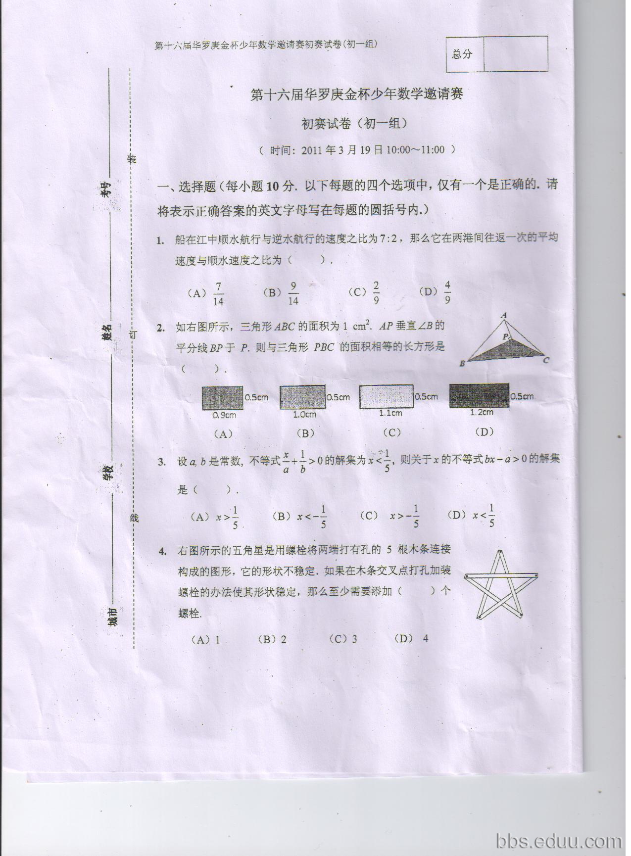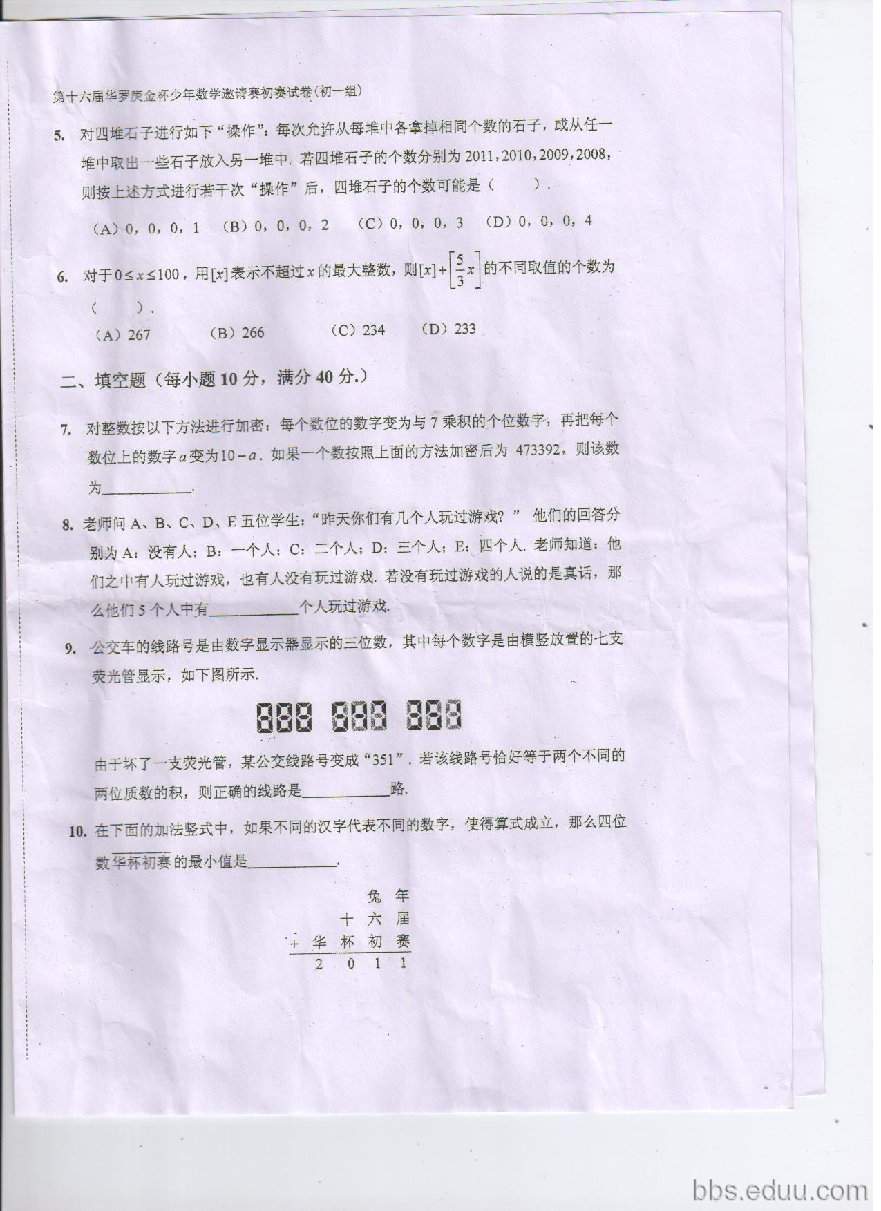 2011年第16届华杯赛初中组初赛试题及答案如下: