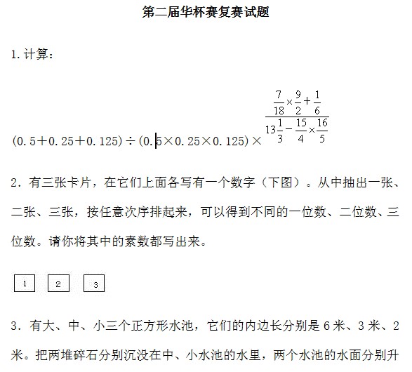 第二届华杯赛复赛试题及答案 成都中考网 2011-07-29 17:36:06 请下载附件: 第二届华杯赛复赛试题及答案 本地下载 推荐阅读: 2011年第九届小学希望杯初赛四年级组试题 第十六届华杯赛总决赛试卷二(惠州)