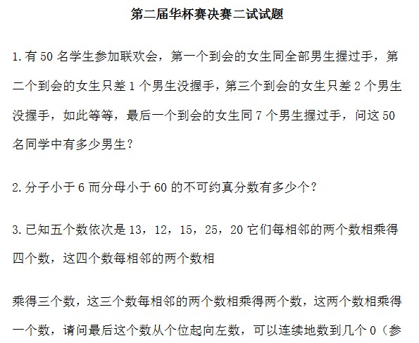 第二届华杯赛决赛二试试题及答案 成都中考网 2011-08-01 10:54:22 请下载附件: 第二届华杯赛决赛二试试题及答案 本地下载 推荐阅读: 第十六届华杯赛总决赛试卷二(惠州) 2011第16届华杯赛初中组初赛试题及答案