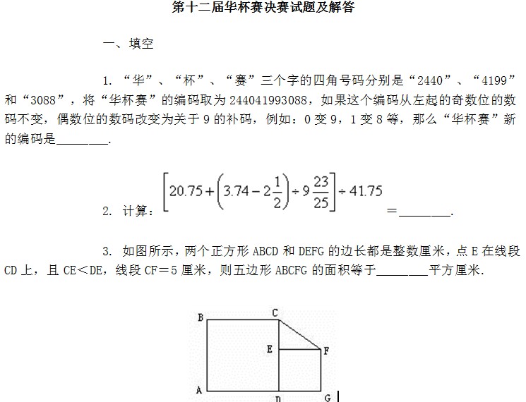 第十二届华杯赛决赛试题及解答 成都中考网 2011-08-04 15:44:45 请下载附件: 第十二届华杯赛决赛试题及解答 本地下载 推荐阅读: 第十一届华杯赛决赛试题及解答 第十届华杯赛决赛试题及解答 第九届华杯赛决赛试题及解答