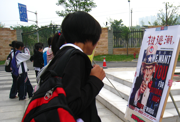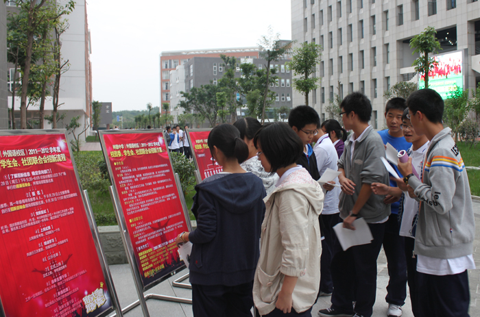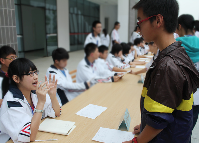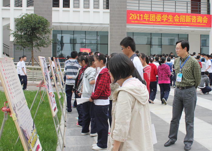 “我有大梦想,我要大舞台!”本学期第五周,树德中学外国语校区2011年团委学生会招新工作正式拉开序幕。学生干部进班级宣讲,各部门制作并展出招新海报,LED展示已毕业学生干部的工作感言,校园广播台播出特别节目等,丰富而精彩的宣传工作让很多新同学感受到了团委学生会的魅力,同时也锻炼了学生干部的“战斗力”。9月28日下午,“2011年团委学生会招新咨询会”成功举办,现场吸引了众多学生前来咨询。同学们热情高涨,都想在团委学生会这个大舞台上展现自己的风采。一位“办公室”的学生干部兴奋的告诉我们,树德中学高一年级全年级450多名学生,招新咨询会短短半个小时的时间里,报名人数就超过了三百名。据悉,国庆节后,面试答辩与相关培训工作将陆续展开。