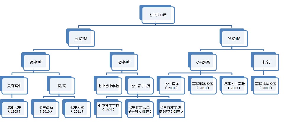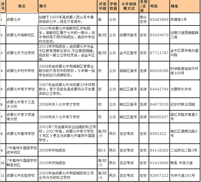 3所公立高中,其中最老的名叫成都七中,现在只有高中;七中高新和万达有高中和初中,分别从2010和2011年招生;