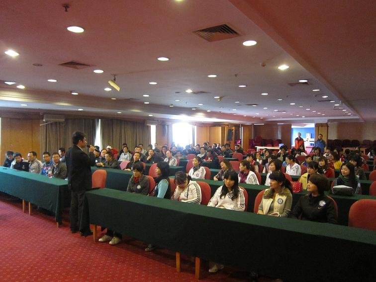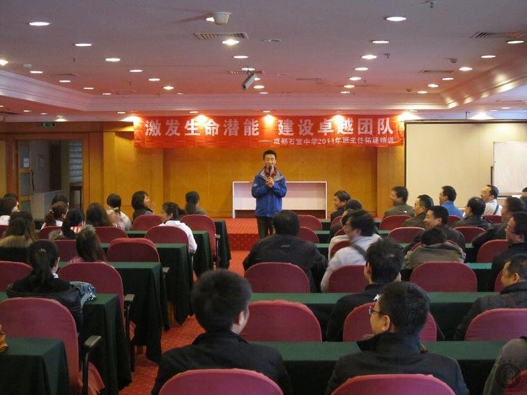 2011年11月19日,在石室中学教育处组织下,副校长吕梅、校长助理张显国,教育处主任叶幼梅、副主任吕渊、王东、蒋宇英带领两校区全体班主任来到风景优美的龙泉湖参加为期一天的素质拓展训练。本次拓展训练以“激发生命潜能,建设卓越团队”为主题,在专业素质拓展培训机构“人众人”公司精心组织下,石室中学全体班主任积极配合,被男女混搭的随机分成七个拥有自己队名、口号、logo和队歌的团队。一天的培训中,在各自培训师的带领下,七个团队分别完成了断桥、背摔、“鼓动人心”和游戏串烧共四个板块的素质拓展训练。所完成的项目中,大家不仅要建立起对自己团队的信心,还要勇于挑战自我。不仅要树立起团队合作的意识,还要明白自己对团队的重要性。
