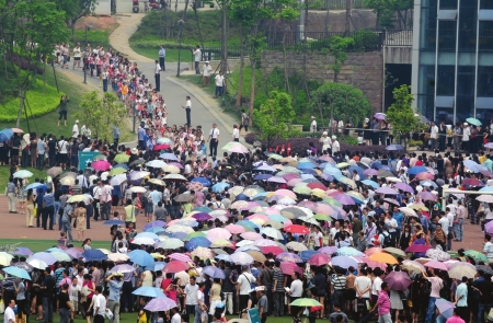 今年的实外西区,只能用“火爆”一词概括!800个名额,却有10000名考生参考。入围比例为12:1,竞争相当激烈。家长们都是起个大早,简单洗漱一番后,便带着孩子火势赶到成都市实验外国语学校(西区)参加小升初考试。由于前来考试的学生和陪考的家长人数众多,开考前学校周围道路被挤得水泄不通。在学校门口的蓝色公告上写着,9点到10点30分为语文考试时间,10点50分到12点20分为数学考试时间。开考后,学校操场上、体育馆里,甚至过道和草地上都站满了陪考家长,放眼望去密密麻麻一片。