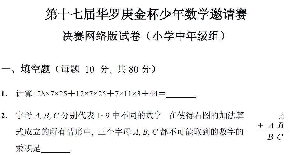 第十七届华杯赛网上决赛试题小学中年级组 本站原创 2012-04-13 09:46:36 第十七届华杯赛网上决赛试题小学中年级组 下载请点击:第十七届华杯赛网上决赛(小学中年级组) 答案: 推荐阅读: 第十七届华杯赛网上决赛六年级试题 成都实外小升初咨询报名截止4月20日 2011成都七中嘉祥小升初综合素质测试卷 名师支招:小升初后如何在初中取得领先?