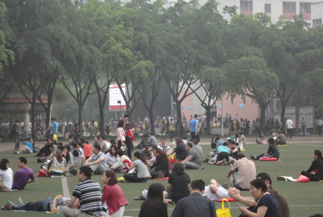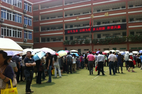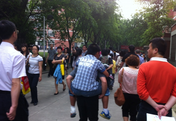 中午太阳冒出来了,家长们在考场外焦急的等待着孩子们。从考试现场来看,嘉祥这次考试组织和管理很不错,基本上有条不紊,次序井然,只是学校外面的路就乱成一团了。