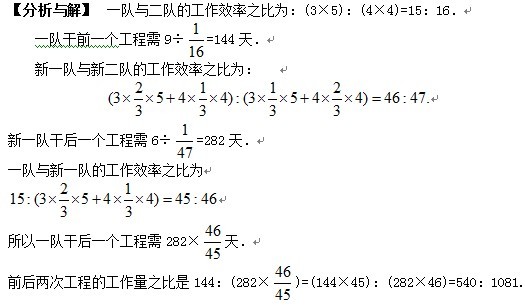8.一队和二队两个施工队的人数之比为3:4,每人工作效率之比为5:4,两队同时分别接受两项工作量与条件完全相同的工程,结果二队比一队早完工9天。后来,由一队工人2/3与二队工人1/3组成新一队,其余的工人组成新二队。两支新队又同时分别接受两项工作量与条件完全相同的工程,结果新二队比新一队早完工6天。试求前后两次工程的工作量之比?