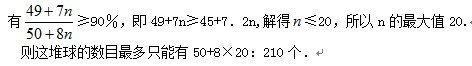 (49+7 )÷(50+8 )×100%=90%,解得 =20,所以最多可取20次,此时这堆球的数目最多只能有50+8×20=210个。