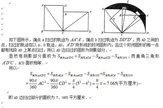 7.如图30-14,将长方形ABCD绕顶点C顺时针旋转90度,若AB=4,BC=3,AC=5,求AD边扫过部分的面积。( 取3.14)