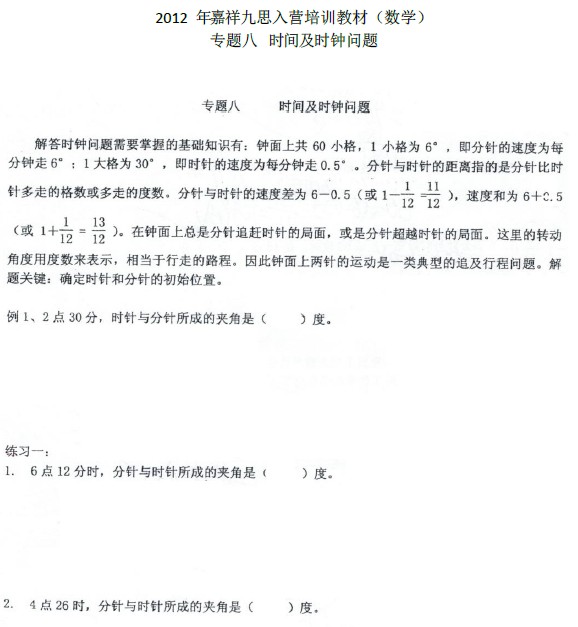 入营后由嘉祥名师余加秋带领团队,封闭式集训语文数学两科,在入营培训期间数学有九个专题讲解,以下是2012年嘉祥九思入营培训教材(数学)--时间及时钟问题专题详细内容,供大家下载。