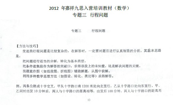 入营后由嘉祥名师余加秋带领团队,封闭式集训语文数学两科,在入营培训期间数学有九个专题讲解,以下是2012年嘉祥九思入营培训教材(数学)--行程问题专题详细内容,供大家下载。