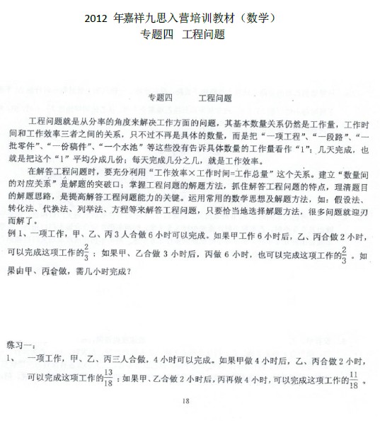 入营后由嘉祥名师余加秋带领团队,封闭式集训语文数学两科,在入营培训期间数学有九个专题讲解,以下是2012年嘉祥九思入营培训教材(数学)--工程问题专题详细内容,供大家下载。