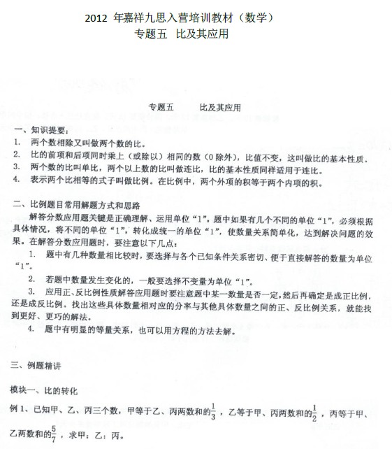 入营后由嘉祥名师余加秋带领团队,封闭式集训语文数学两科,在入营培训期间数学有九个专题讲解,以下是2012年嘉祥九思入营培训教材(数学)--比及其应用专题详细内容,供大家下载。
