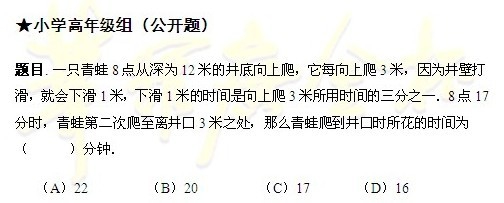 成都奥数网3月21日 华杯赛作为目前成都地区乃至全国最权威的小学数学比赛之一,备受本市各重点中学的认可。每年华杯赛中获奖的同学受到了各大名校的青睐,甚至单凭优异的华杯赛获奖成绩就可以顺利进入这些名校。每一年在初赛之前都会公布一道初赛公开题,第十八届华杯赛小高年级组和小中年级组初赛公开题也已出炉,具体题目如下: