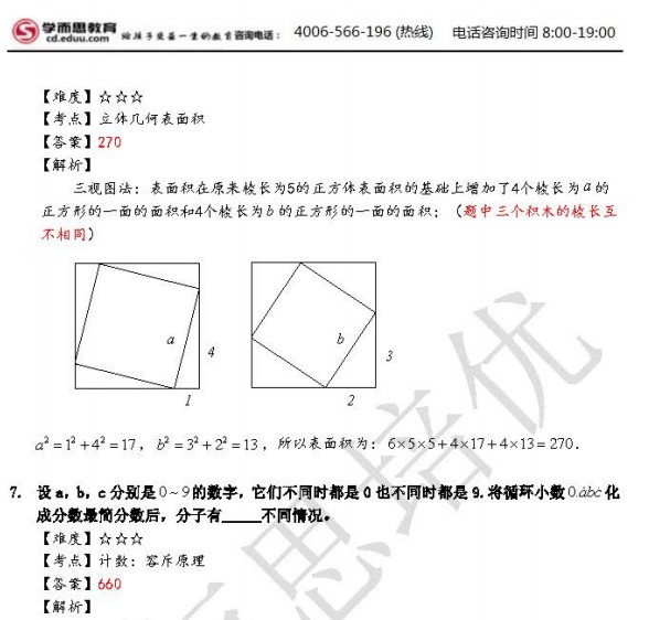 成都最有可能考察的B卷题目将以备用卷考察。虽然铁定不再考察B卷,但是华杯赛一脉相承的出题思路,还是非常值得大家认真研读一番。成都小升初指导中心呼群、周艳丽老师为大家做了详解,请同学们务必认真研究。以下是本届华杯赛决赛小高年级组C卷详解: