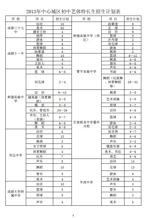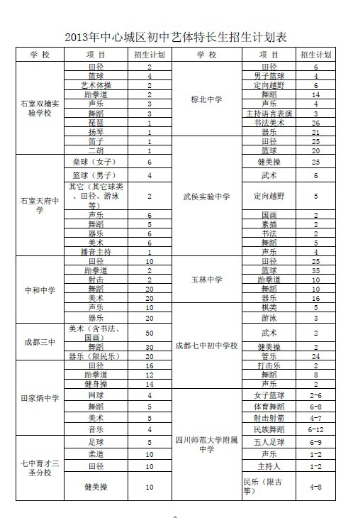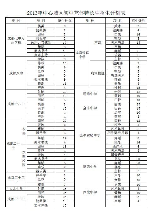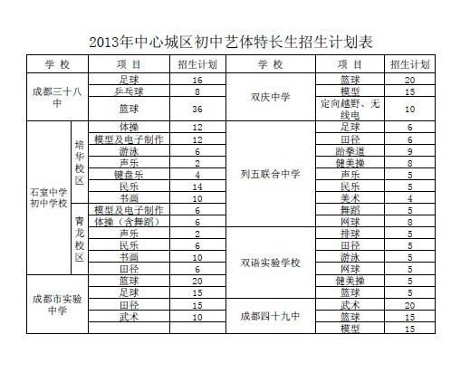 今年我市招收艺体特长生的学校有:成都七中万达学校、成都铁路中学、成都八中、锦中学、成都十八中、金牛中学、成都二十中、金牛实验中学、锦西中学、成都三十三中、人北中学、成都十二中、西北中学、棕北中学、石室双楠实验学校、石室天府中学、武侯实验中学、中和中学、玉林中学、成都三中、成都七中初中学校、田家炳中学、四川师范附属中学、七中育才三圣分校、成都七中育才学校、成都十七中、盐道街中学、盐道街中学实验学校、七中育才、四川师范大学附属中学外语学校、成飞中学、石室联合中学(西区)、老校区(陕西街)、石室联合中学新校区(金沙)、文翁实验中学、树德实验中学(东区)、成都三十七中、成都十一中、树德实验中学(西区)、青羊实验中学、树德实验中学、石室联合中学蜀华分校、列五中学、成都大学附属中学、华西中学、成都三十八中、石室中学初中学校、成都市实验中学、列五联合中学、双庆中学、双语实验学校、成都四十九中。