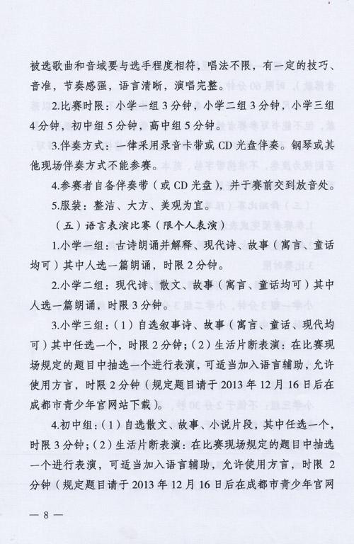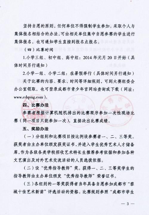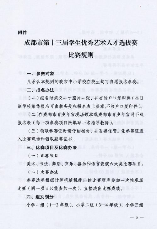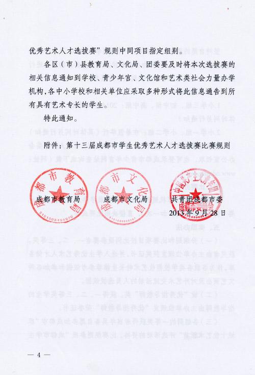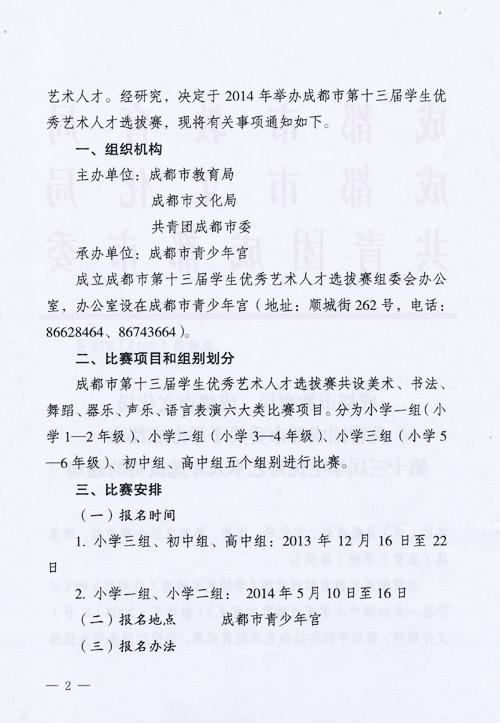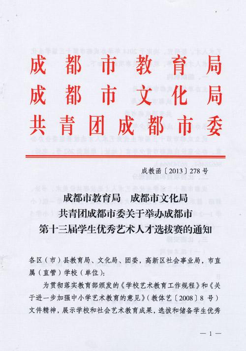 关于举行成都市第十三届学生优秀艺术人才选拔赛的通知 成都青少年宫 2013-11-18 13:56:59 成都奥数网讯 相关阅读: 2013成都艺体特长生各校录取名单“出炉” 石室联中金沙校区2013小升初艺体特长生名单 2013年初中各校艺体招生计划
