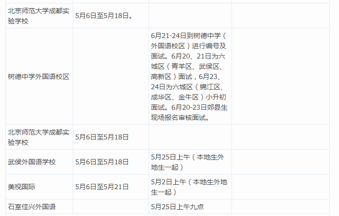 6月21-24日到树德中学(外国语校区)进行编号及面试。6月20、21日为六城区(青羊区、武侯区、高新区)面试,6月23、24日为六城区(锦江区、成华区、金牛区)小升初面试。6月20-23日郊县生现场报名审核面试。 |