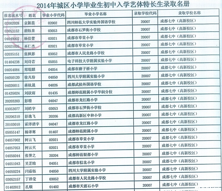 成都七中2014小升初入学艺体特长生录取名册 家长帮社区 2014-06-26 14:00:46 成都奥数网:成都七中2014年小升初入学艺体特长生录取名册出来了,快来看看吧。 【查看原帖并参与讨论:成都七中2014年城区小学毕业生初中入学艺体特长生录取名?】