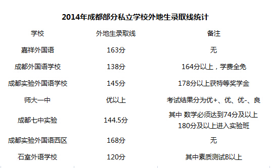 【总结】:对于成都小升初的外地生来说,2015小升初,恐怕无论如何都逃不过私立学校的招生考试了。每年私 立学校的招考一般都在五一节前后进行,通常外地生的考试要早于本地生的考试,试题难度要小于本地生,但是各私立学校的小升初录取线之高,也要求学生真正有 实力才行。下面是小编统计到的成都部分私立名校的2014年外地生源的小升初录取分数线: