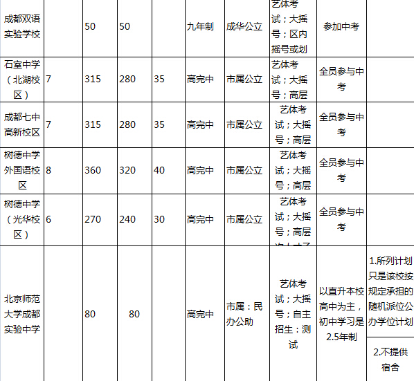 北京师范大学成都实验中学:可住校,摇号生不提供住宿.设闵恩泽实验班、英语实验班、数学实验班.40%可升本校高中。2014派位审核通过人数443人,录取率18.06%。
