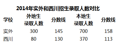 实外会为20%的学生提供1-4等奖学金,实外的英语实验班需要孩子上线后再加试英语考入。西川不提供奖学金,这样势必很多尖子生不会选择西川。但西 川招生人数不多,每年就500以内,从学位供给和需求来说,西川的生源还是不错。最终的情况是,西川尖子不多,差生经过考试后也已筛出,中考能有一个不错 的重点线上线率。