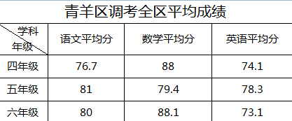 9月份开学的时候,成都青羊区举行了全区四、五、六年级学生的调考。所谓调考就是每年学期开学或期末,各区举行的抽查学校考试,即调研考试,也有人称之为ACTS学业评价(“学业素质与能力评价系统”)。很多成都小升初的家长都非常重视这次调考的成绩,把调考成绩视为2015成都青羊区择校的一颗“救命稻草”,现将本次青羊区调考成绩公布如下。
