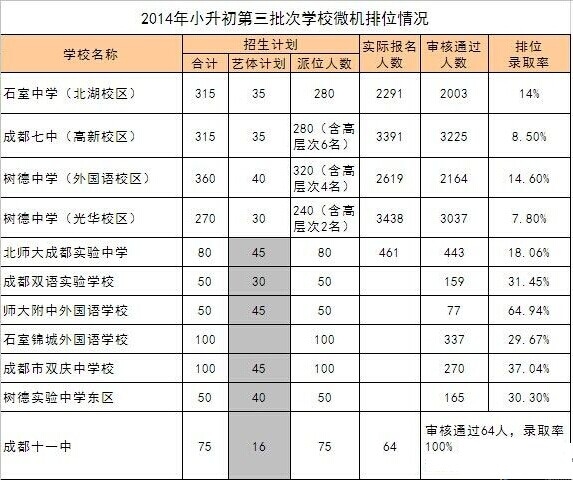编后语:2015成都小升初要想进入公办名校拼的是实力+运气,“百万雄师其摇号”的激烈竞争注定了是几家欢喜几家愁,所以,小编建议2015小升初目标摇号进公办名校的家长一定要事先为孩子选好保底学校。
