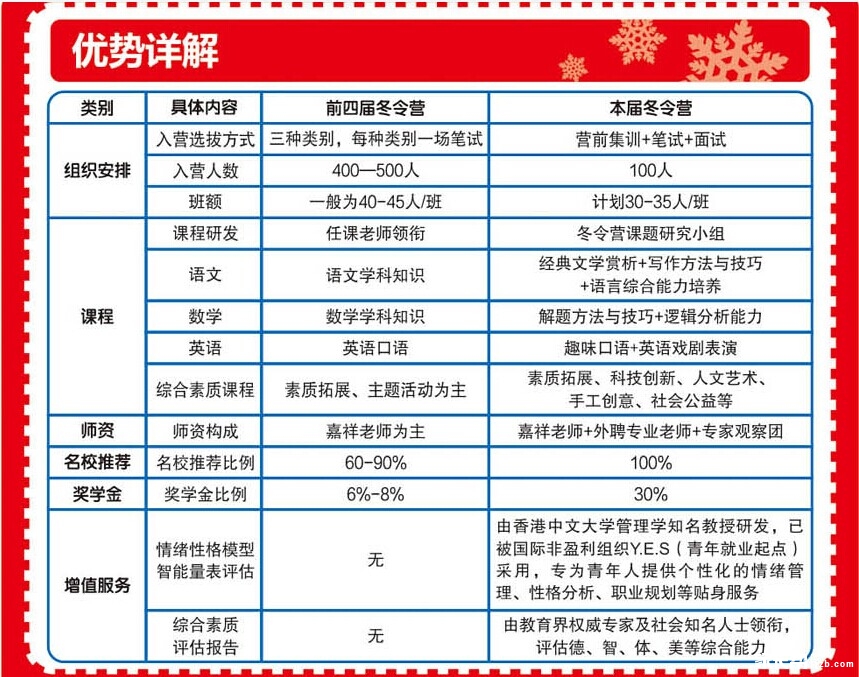 总结:报名的时候提到,参加冬令营营前集训班的可享受优惠,插班生不享受优惠,也就是说,要参加嘉祥九思的冬令营,也可以不参加他们的集训班,到时候直接去报插班生,这样也可以参加冬令营。至于是否要参加此次营前培训,家长们还要根据自家的实际情况选择。