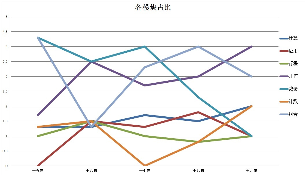 此图为华杯赛各模块考察题量的分布曲线,因为有7个模块,乍眼一看确实会觉得略乱。但是,还是可以看出,7个模块很明显分成了两个梯队,下面四个模块考察频率都比较接近;而有三个模块的曲线则和他们拉开了差距,考察非常多,即:几何、数论、组合。而几何更是有超出我们想象的重要性,一套试卷总共14道题,平均会考察3道。
