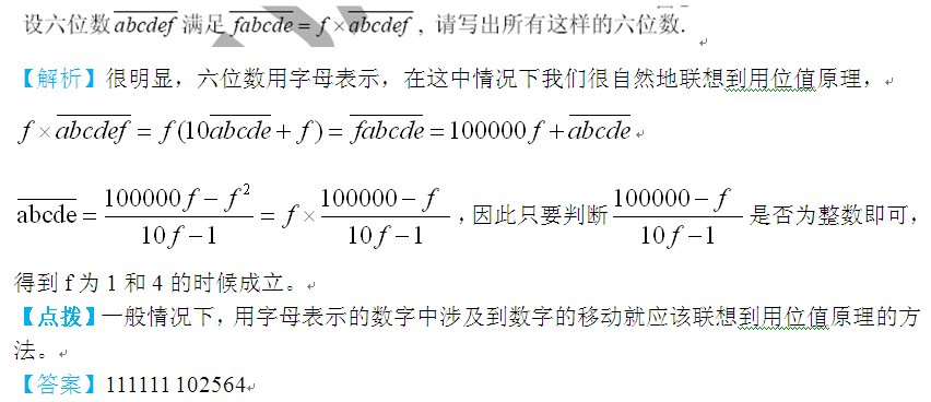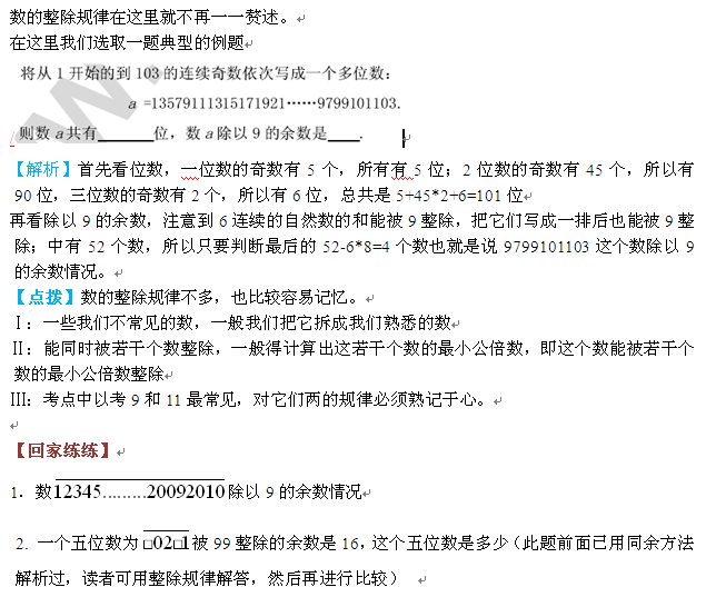 【点拨】对于这类很大的数,尤其是几次方的题目,一般我们采用同余的方法,将大数化小。运算过程中还要注意到余数为1的一些情况,因为若干个余数为1的数相乘后余数还是为1。若用一句话来概括,就是积的余数等于余数的积。