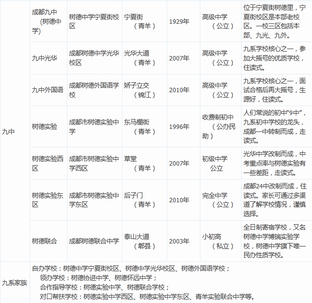 每年成都小升初择校家长们都对479大摇号情有独钟,即使是10%的中奖率也要试一试运气。但是2015成都小升初择校的家长们,您已经认清成都479家族中的所有成员了吗?上周已经盘点介绍了四中、七中家族的成员,本文将再为2015成都小升初的家长们介绍一下九中(树德)家族的成员。